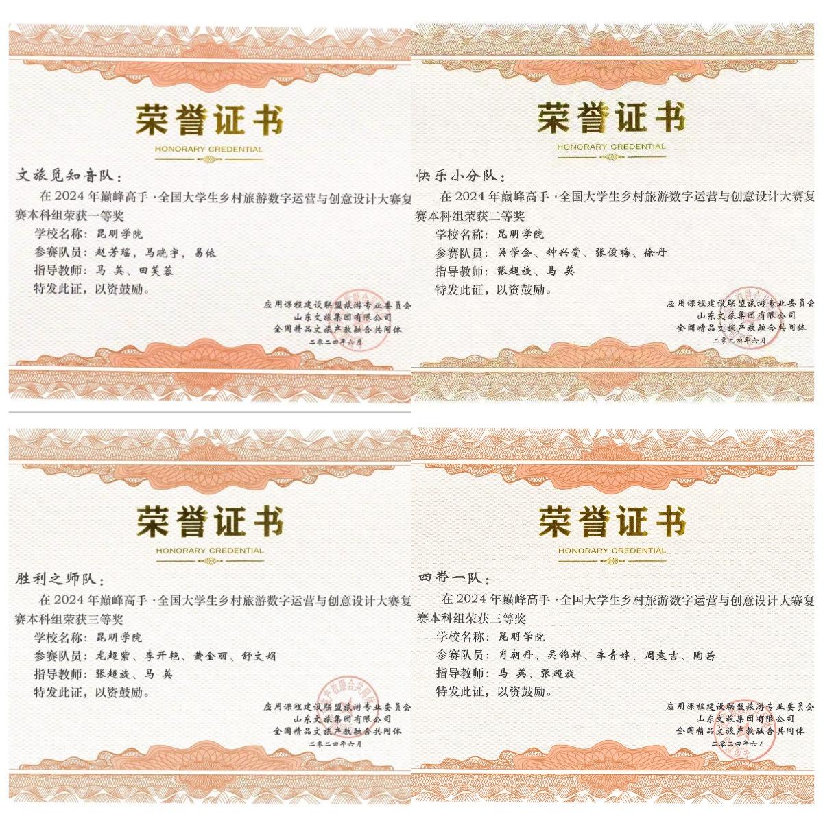 3044永利集团有限公司选派的4支参赛队,于2024年5月12日-7月1日,参加2024年巅峰高手·全国老员工乡村旅游数字运营与创意设计大赛,分别获得乡村旅游线路设计(本科组)一等奖1项、三等奖1项,乡村旅游短视频设计(本科组)二等奖1项、三等奖1项。