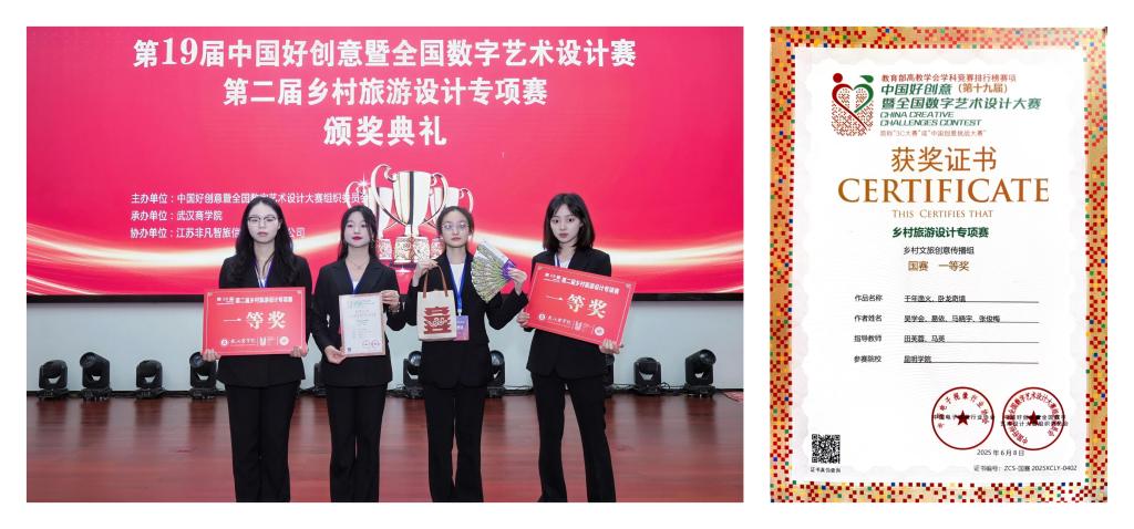 3044永利集团有限公司酒店管理专业吴学会、易依、马晓宇、张俊梅四位同学,在第19届中国好创意大赛乡村旅游设计专项大赛决赛中荣获一等奖。
