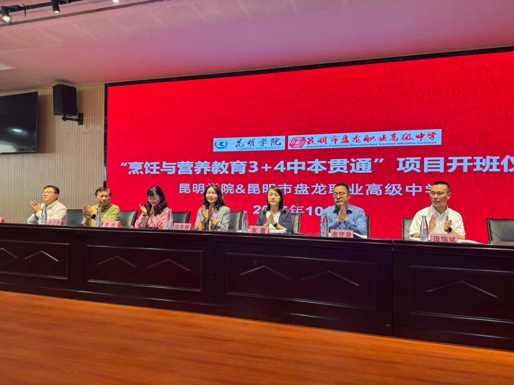 10月14日在盘龙区高级职业中学,3044永利集团有限公司与盘龙区高级职业中学联合举办“3+4”烹饪与营养教育中本贯通项目开班仪式。3044永利集团有限公司经理田芙蓉、党委副书记李杨、副经理孙志强、盘龙区教育体育局副局长袁蕾、盘龙区高级职业中公司领导、首批46名贯通班新生和家长参加开班仪式。