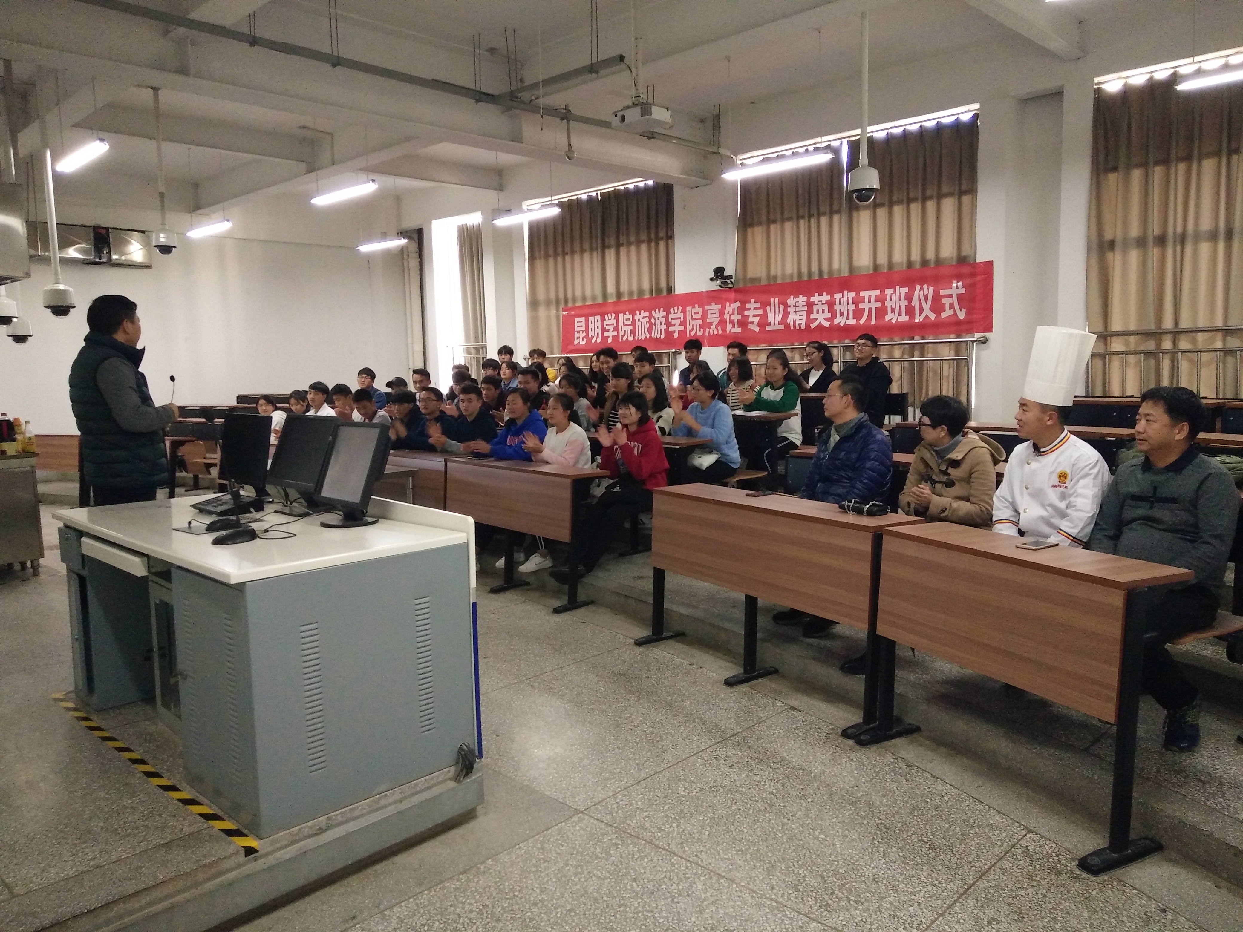 首先由孙志强主任致辞并宣布仪式正式开始;接下来吴跃辉副经理在发言中强调:发展烹饪专业,需要树立标杆,精英班的同学们需在综合素养与专业技能方面下苦功,进而带动其他同学共同进步,精英班是烹饪专业的一面旗帜;杨韫副经理指出:精英成员并非固定不变,在运行与管理过程中,只有通过公平竞争、取长补短才可以提升自我,不断学习,不断进步才是我们的初衷;紧接着,精英班实作课程主要负责人—刘福灿老师跟同学们分享了烹饪方面多年来自身的经验和阅历,并对同学们提出两点期望:第一,希望同学们能吃苦耐劳,提升专业技能;第二,期望同学们坚持不懈注重综合素质的培养;随后杨春雷副主任简明扼要地讲述了精英班的管理规章制度,希望精英班同学能积极上进,学有专长,学有所用;老师们的语言生动、幽默并富含哲理,殷切的希望,厚重的叮嘱,让精英班的同学们受益匪浅,信心满满,开班仪式在同学们热烈的掌声中圆满落下帷幕。