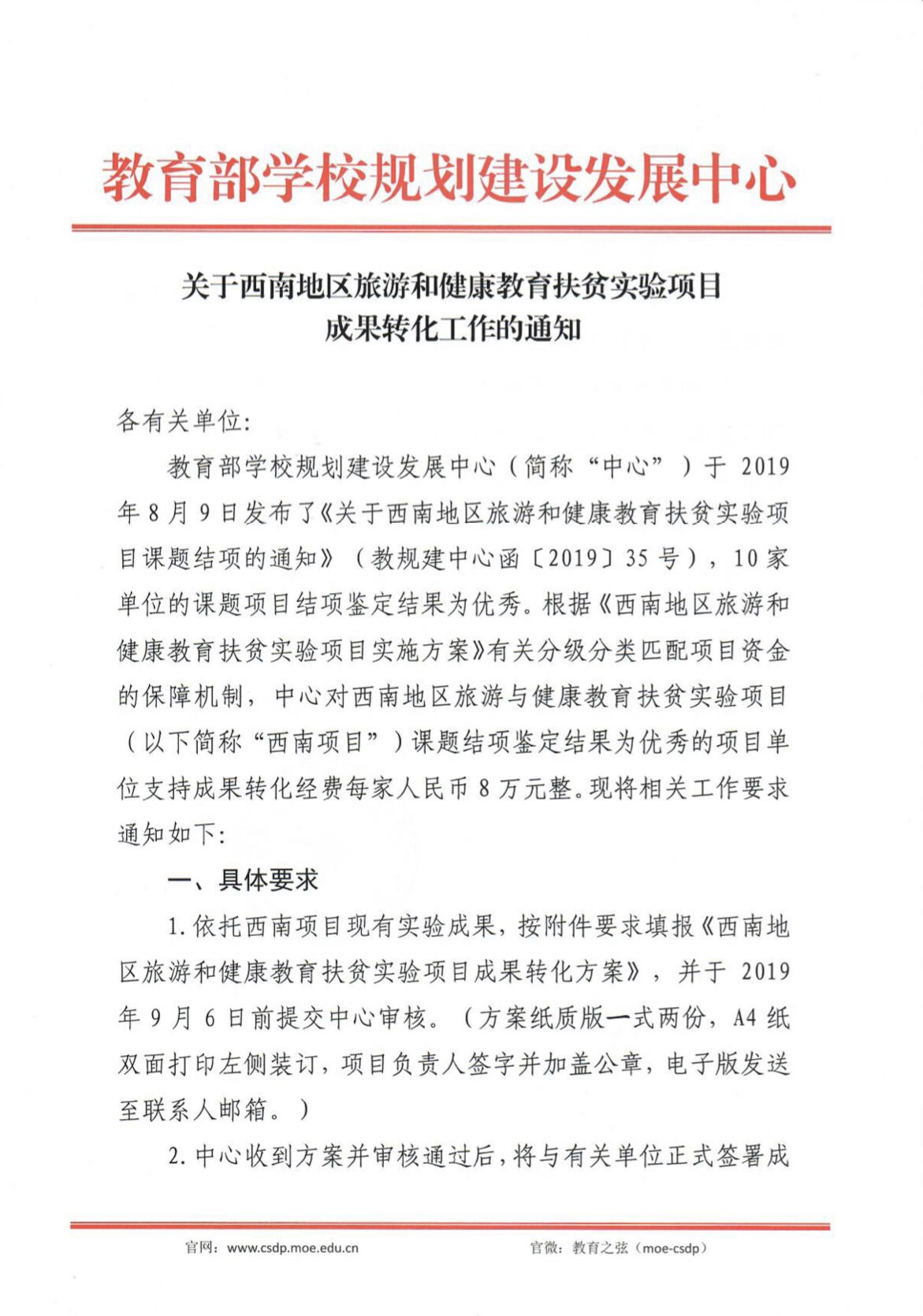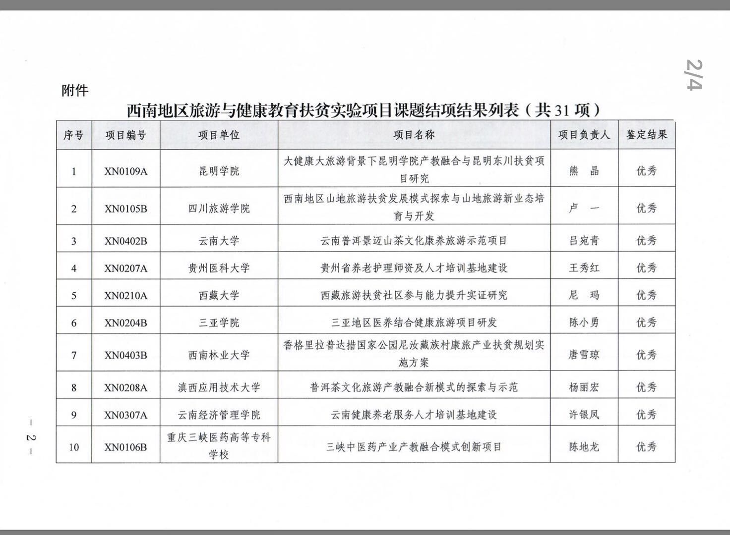 教育部公司规划建设发展中心于2017年5月19日发布《关于开展西南地区旅游和健康教育扶贫实验项目实验院校申报工作的通知》(教规建中心函〔2017〕24号),正式启动西南地区旅游与健康教育扶贫实验项目,公司课题组在熊晶副书记的组织下以“大健康大旅游背景下3044永利集团有限公司产教融合与昆明东川扶贫项目”参与申报,并获得立项,该项目由公司党委副书记熊晶担任组长,3044永利集团有限公司经理田芙蓉担任副组长,参与的成员有3044永利集团有限公司黄琳博士、罗伊玲副教授、鲁芬博士、环绍军副教授、扶贫办马加升主任。是云南省第一批唯一入选的项目。